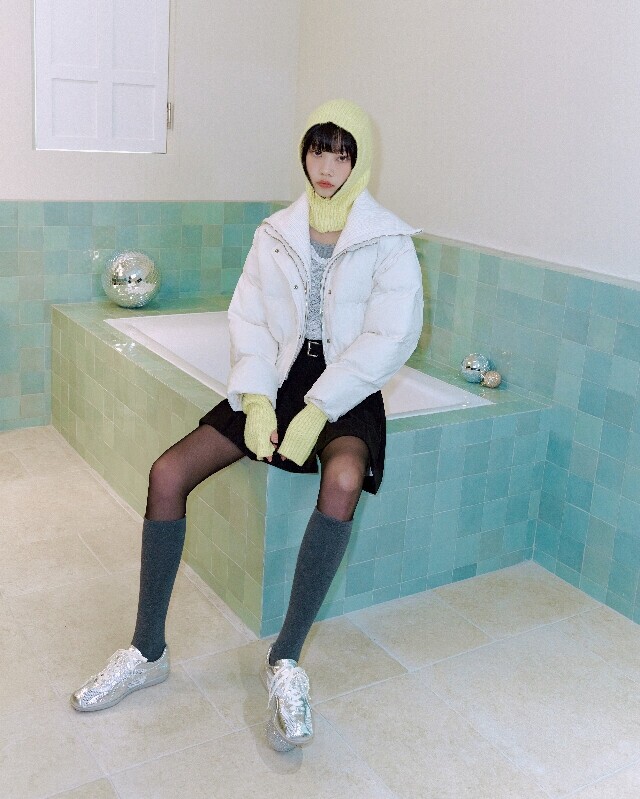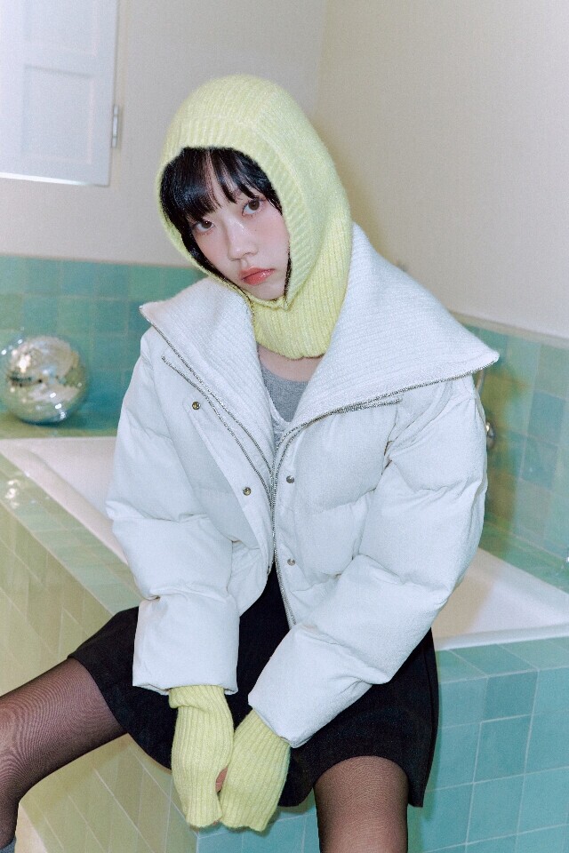 웰론 빅 카라 니트 배색 크롭 패딩 ~