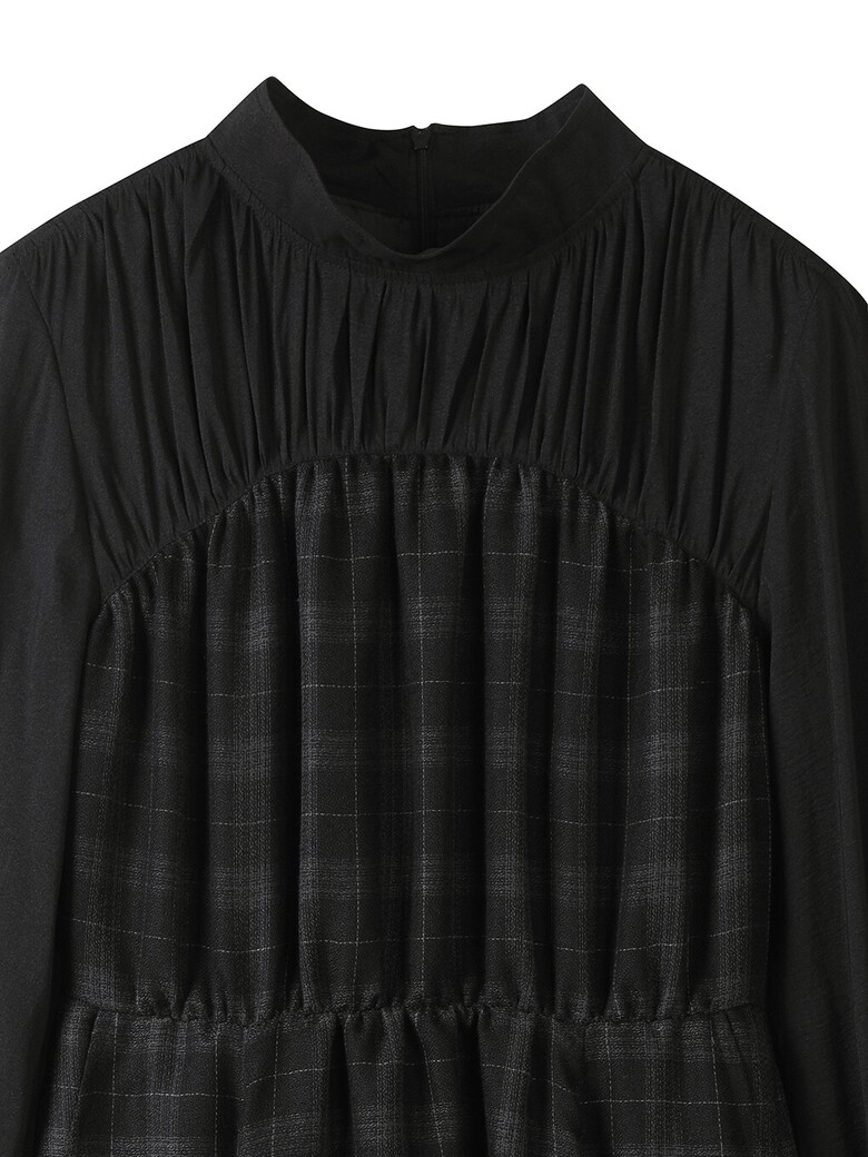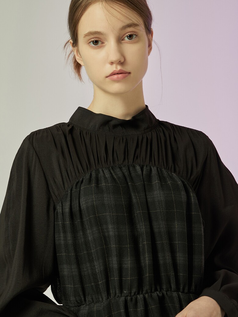 - 서로 다른 두가지 원단을 믹스매치하여 요크에 셔링 디테일로