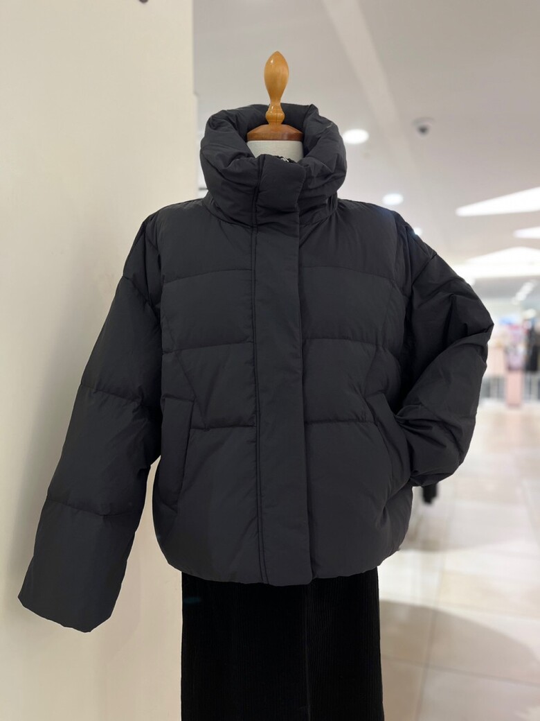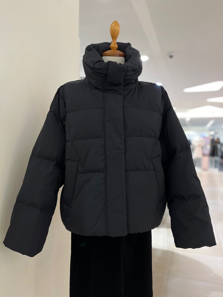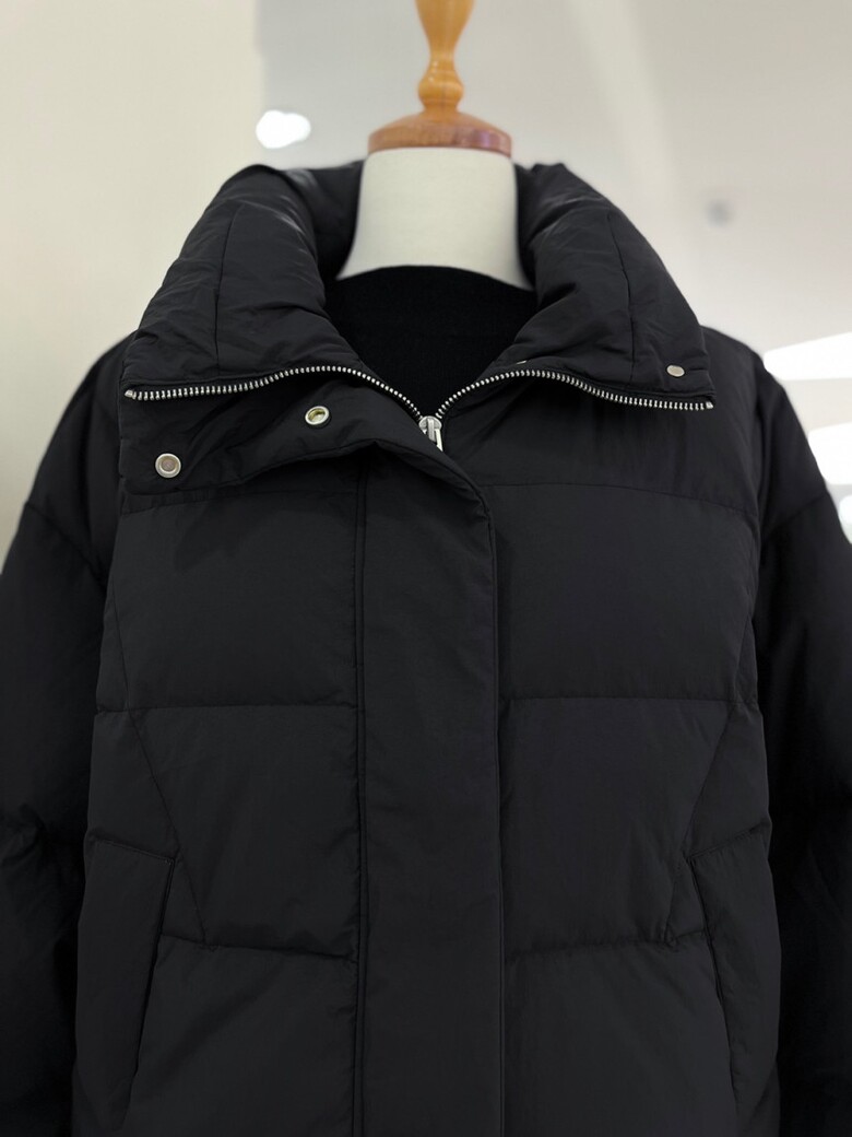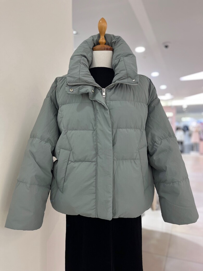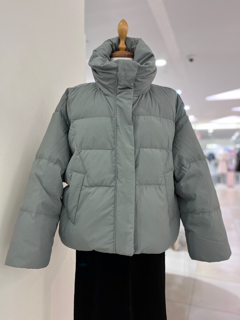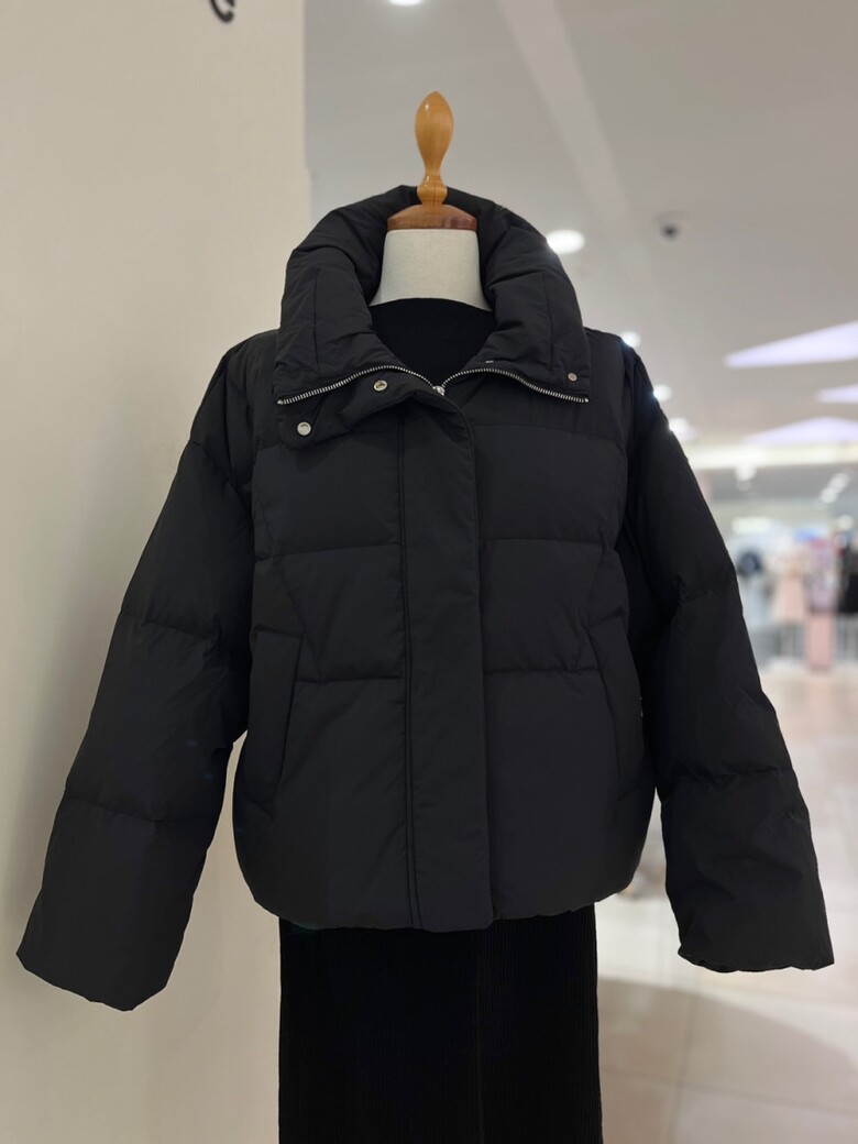 목까지 충분히 감싸는 높은 넥 디자인의 다운점퍼입니다
