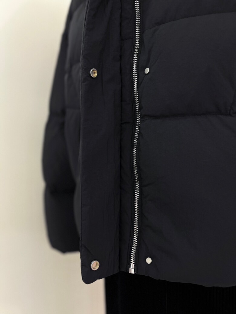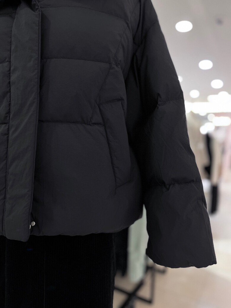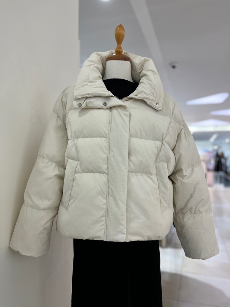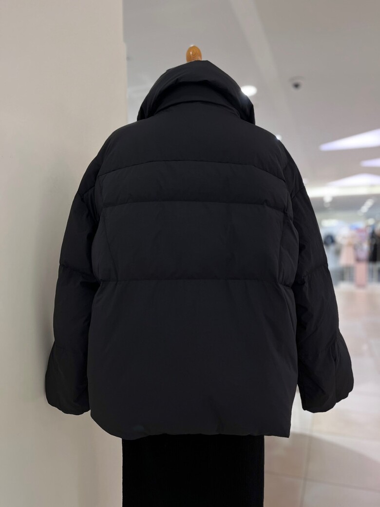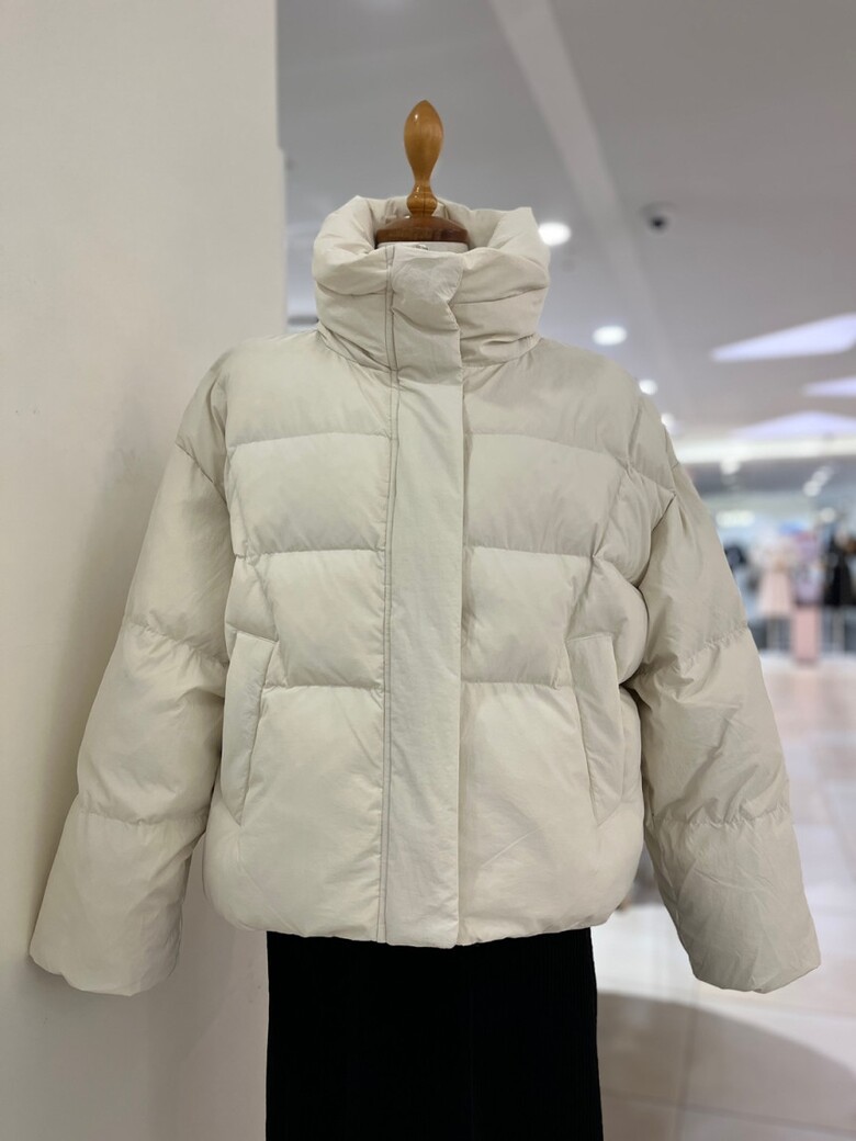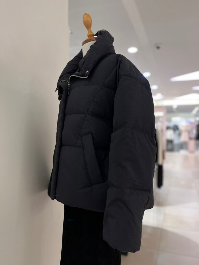 목까지 충분히 감싸는 높은 넥 디자인의 다운점퍼입니다