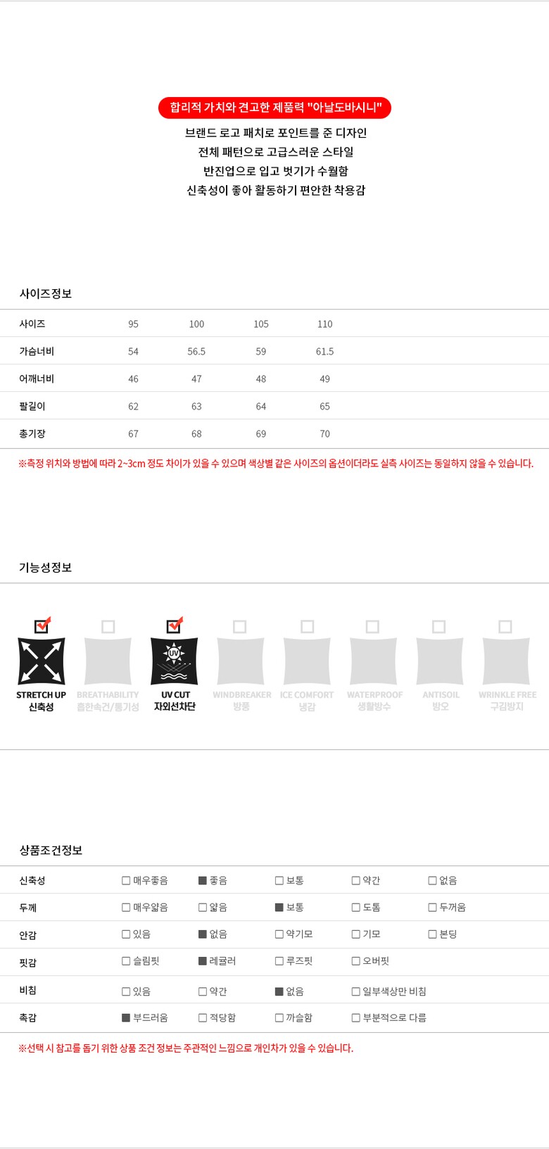 | 1. 제품 소재 (섬유의 조성 또는 혼용률을 백분율로 표시, 기능성인 경우 성적서 또는 허가서) | 상세이미지 참조 |