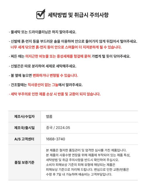 | 1. 제품 소재 (운동화인 경우에는 겉감, 안감을 구분하여 표시) | 상품상세참조 |