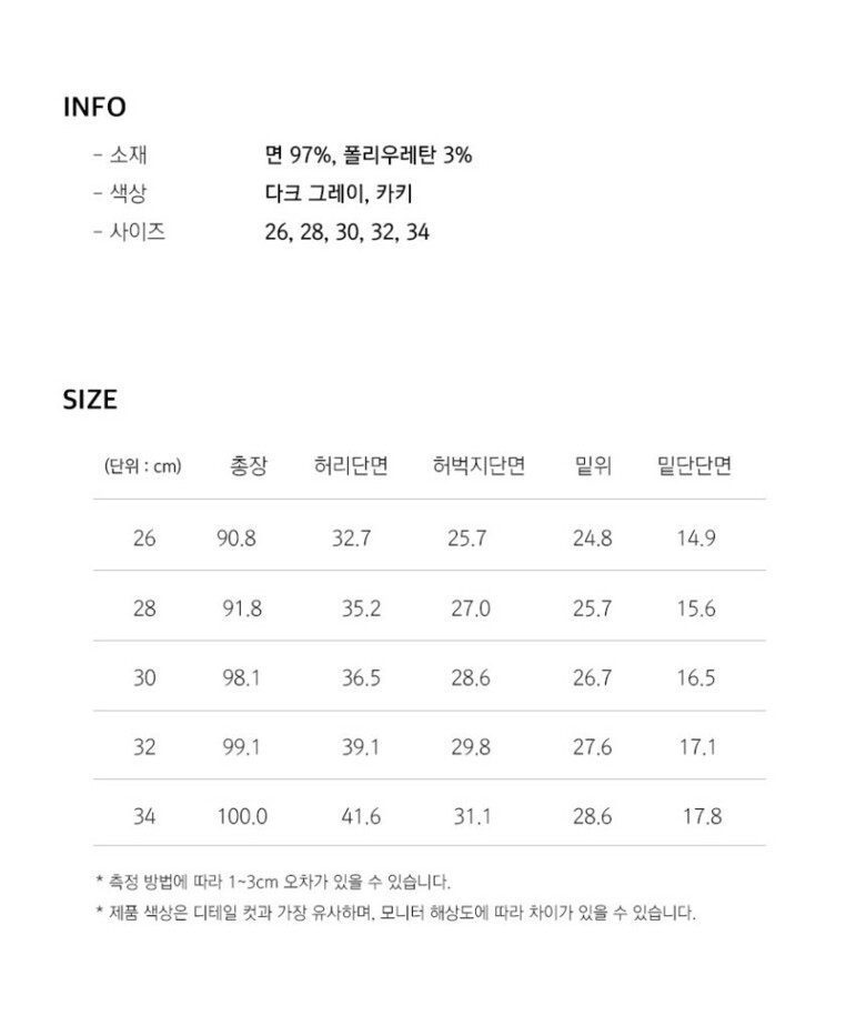 | 1. 제품 소재 (섬유의 조성 또는 혼용률을 백분율로 표시, 기능성인 경우 성적서 또는 허가서) | 겉감:면 97%, 폴리우레탄 3% / 배색:면 100% |