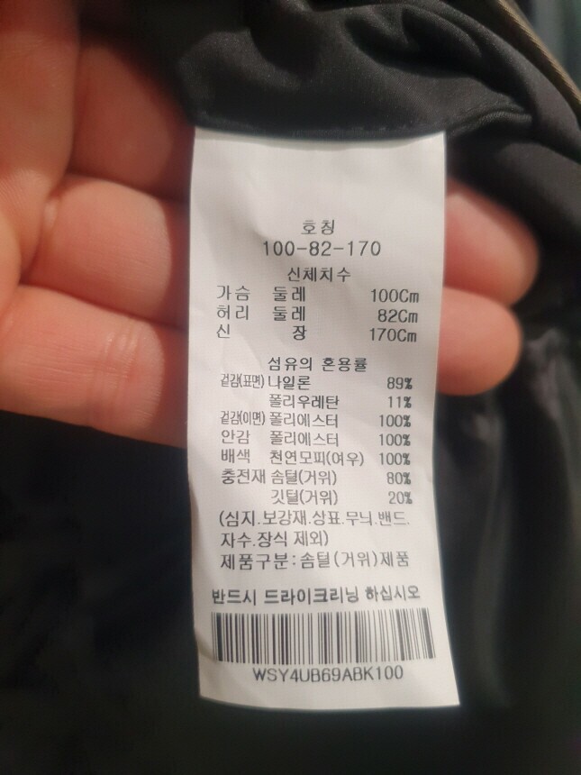 1. 제품 소재 (섬유의 조성 또는 혼용률을 백분율로 표시, 기능성인 경우 성적서 또는 허가서) 겉감(표면) : 나일론 89% , 폴리우레탄 11% 겉감(이면) : 폴리에스터