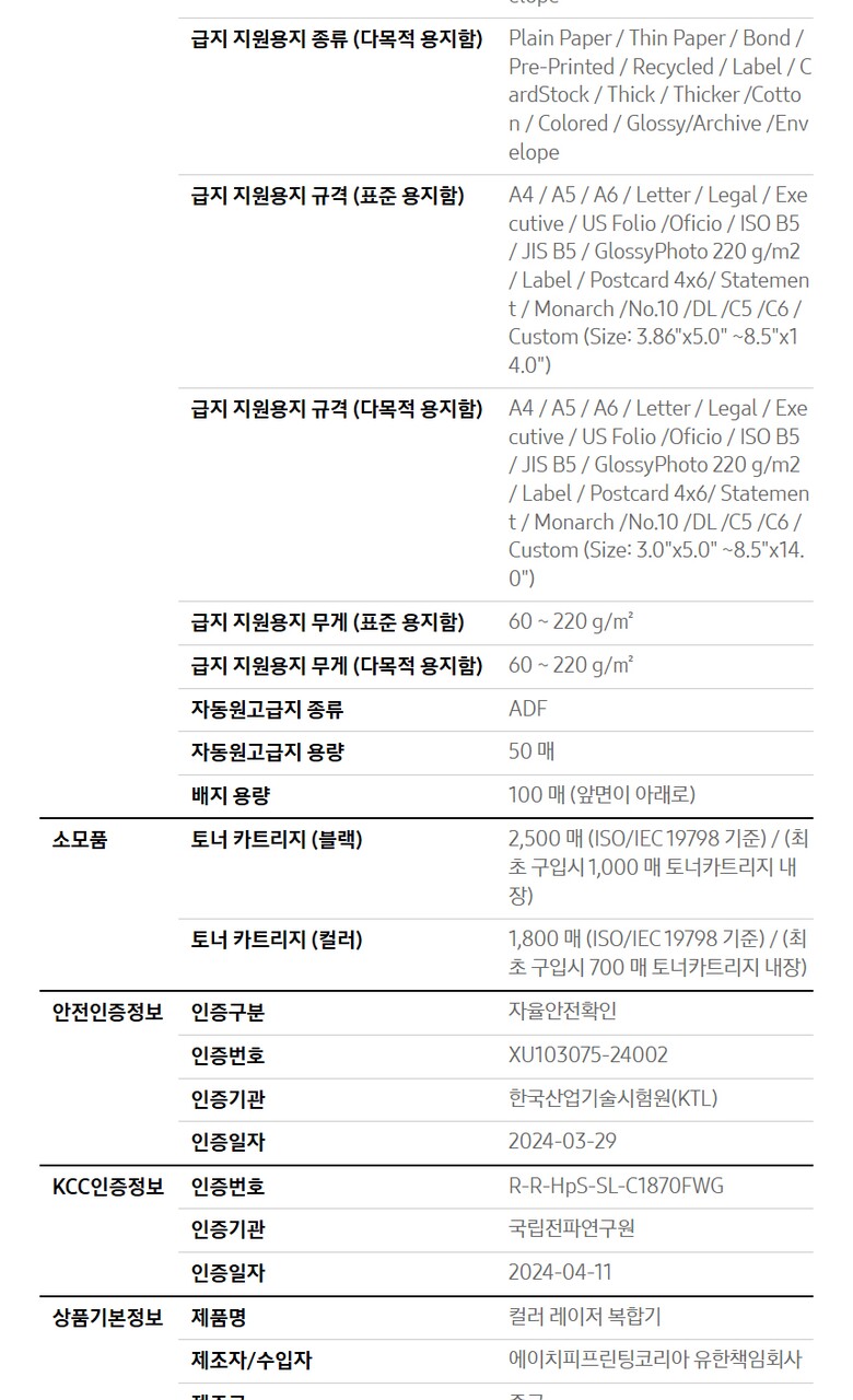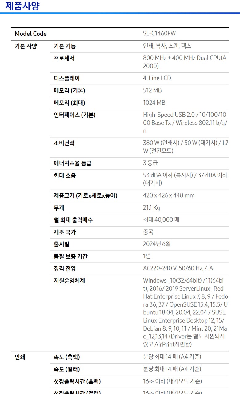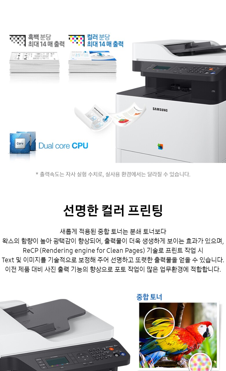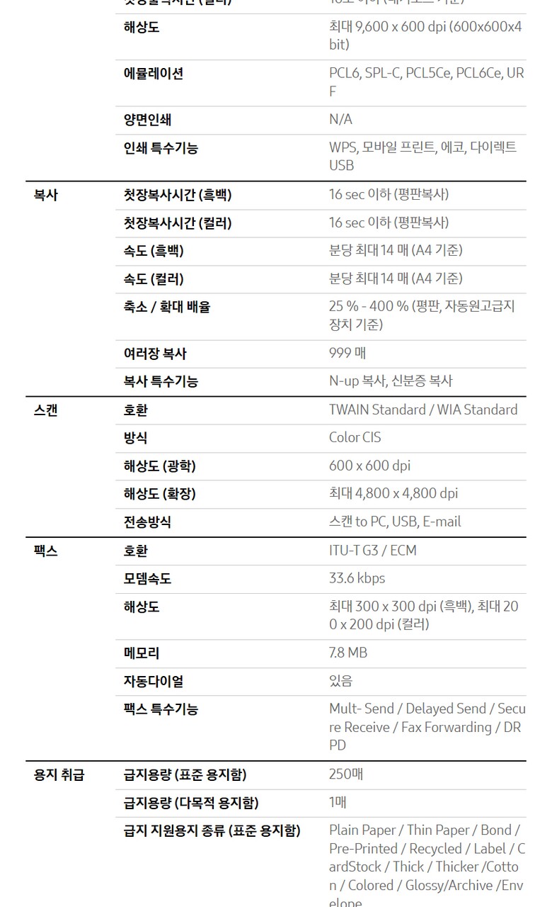 - 복합기/인쇄 방식: 레이저/컬러 출력/복합기 기능: 복사, 스캔, 팩스/컬러출력속도: 14ppm/흑백출력속도: 14ppm/첫 장 인쇄: 16초/인쇄 해상도: 9600x600dpi/자동급지장치/용지함 용량: 250매/A4 출력