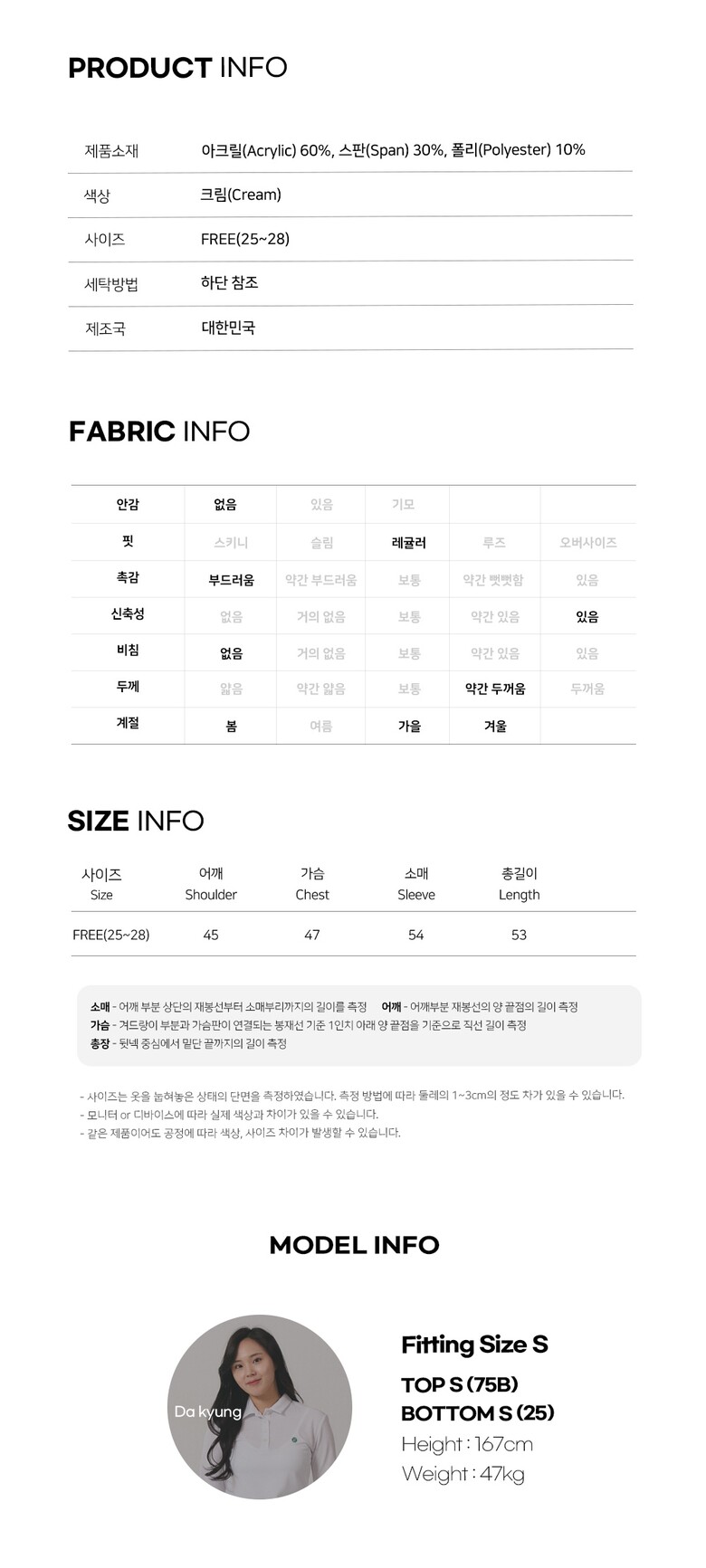| 1. 제품 소재 (섬유의 조성 또는 혼용률을 백분율로 표시, 기능성인 경우 성적서 또는 허가서) | 아크릴60%.폴리10%.스판30 |