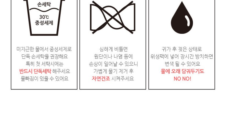 6. 세탁방법 및 취급시 주의사항 | 첫 단독 손세탁 권장, 단독세탁, 손세탁, 중성세제, 찬물세탁 |