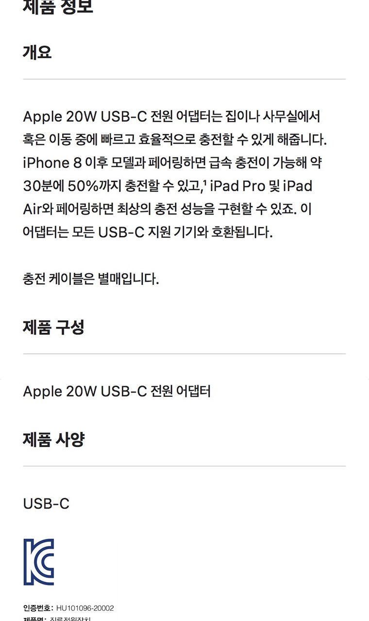 1. 모델명(품번) | 애플 20W USB-C 충전기 어댑터 MUW13KH/A |