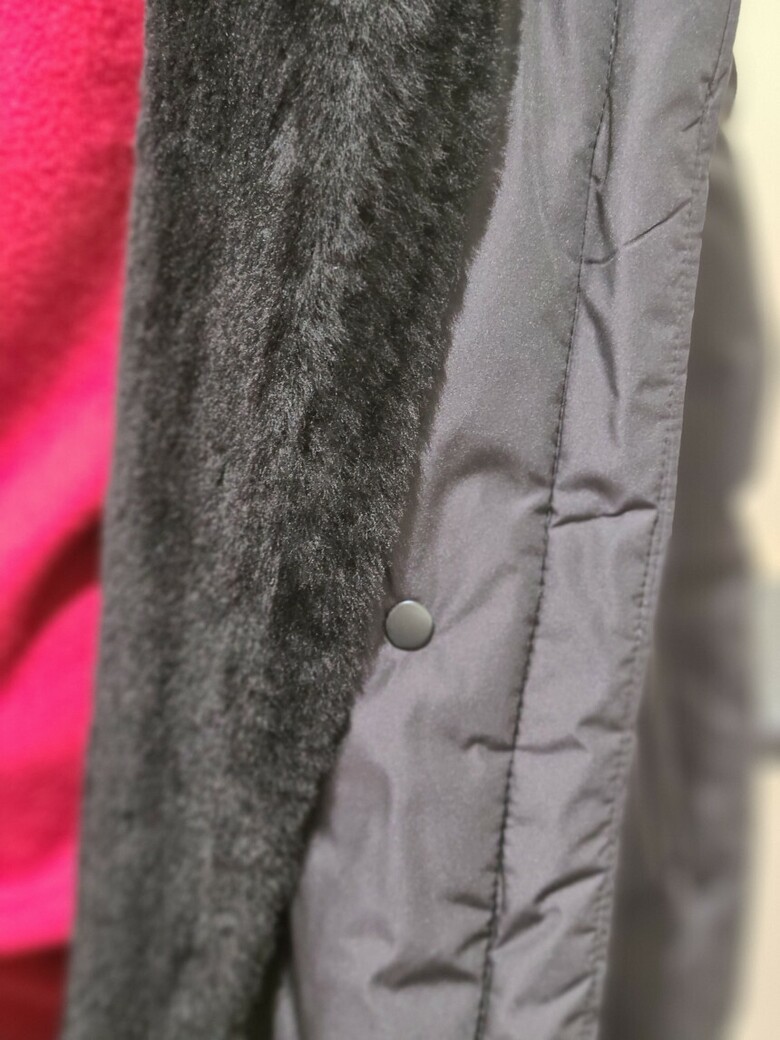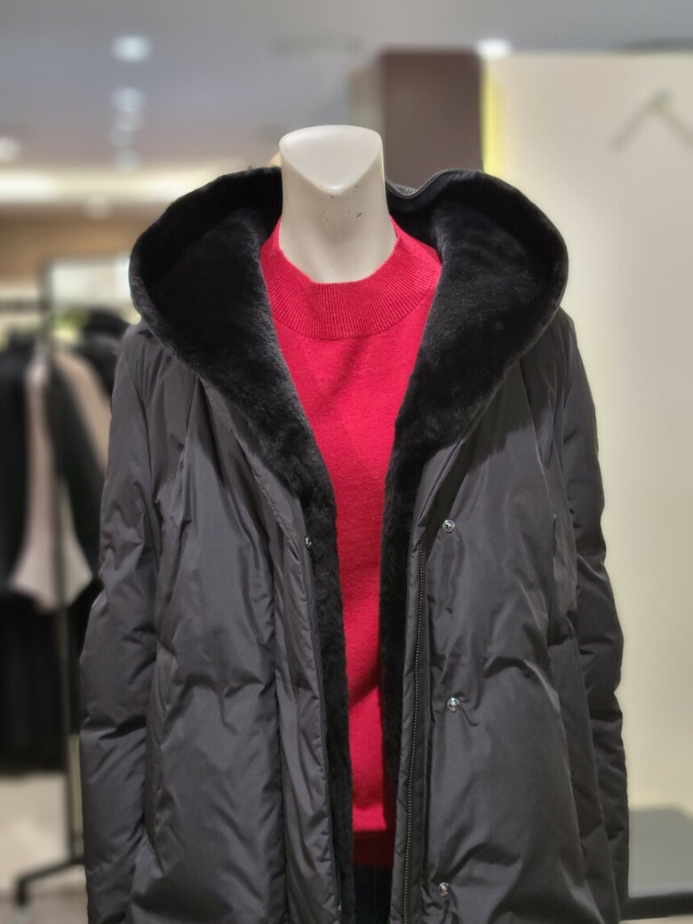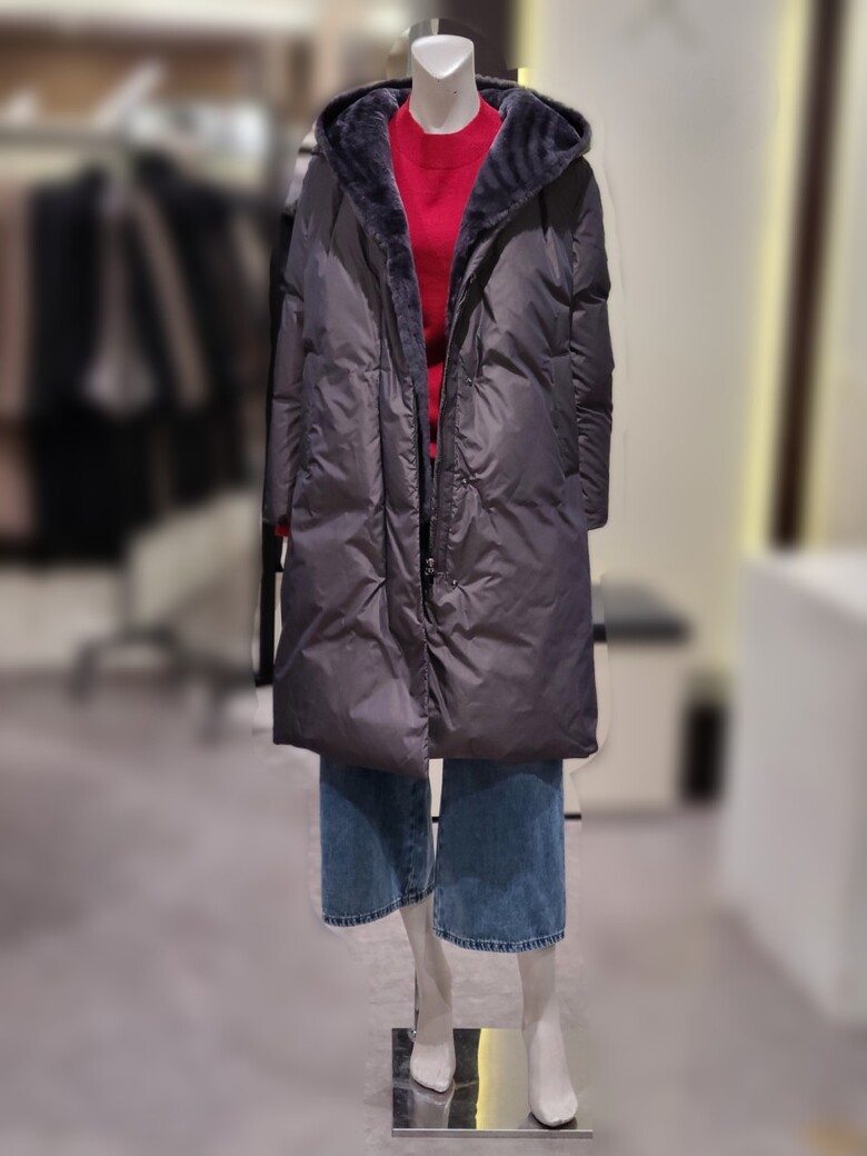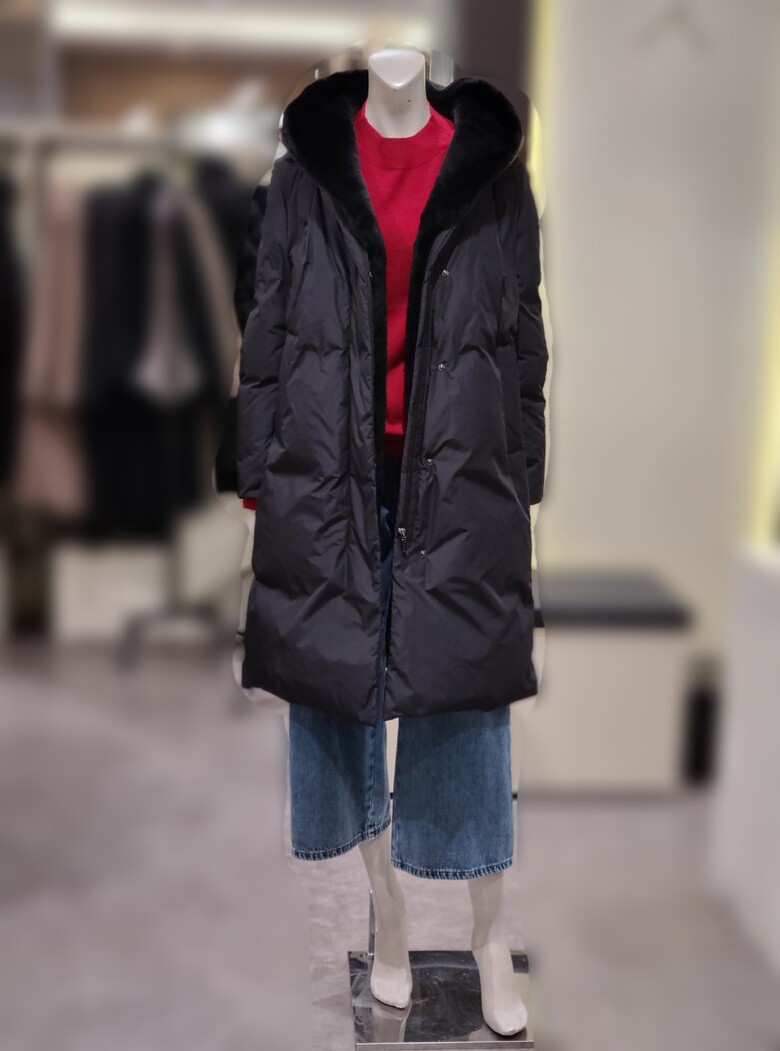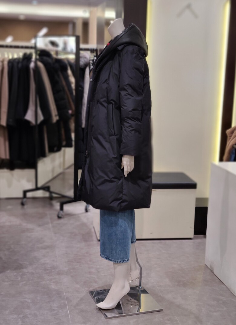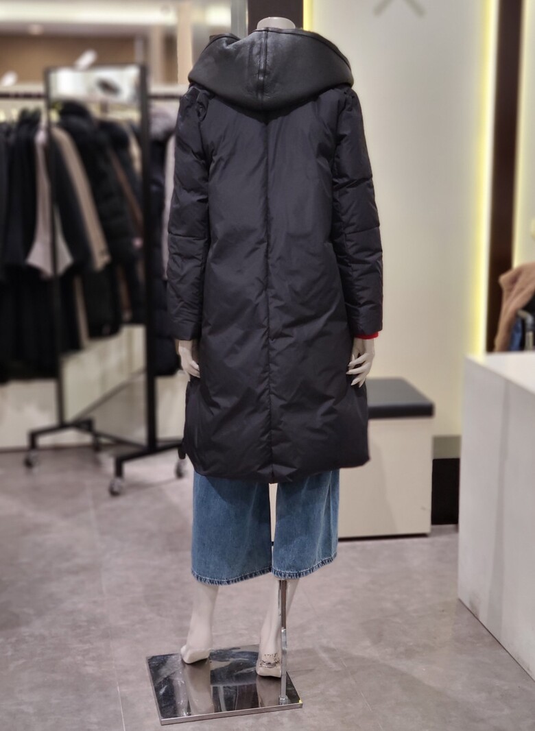 후드 무스탕 탈부착 가능한 구스다운 롱패딩입니다