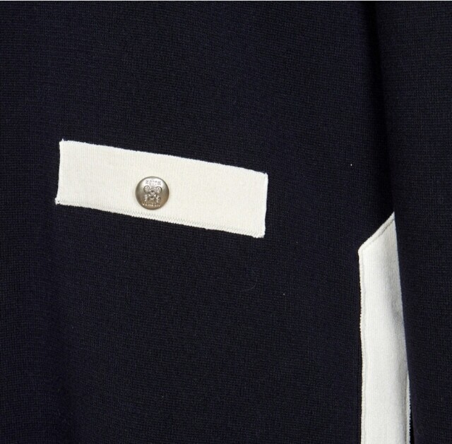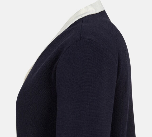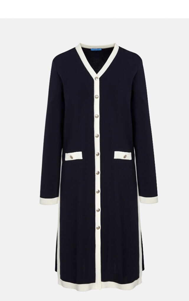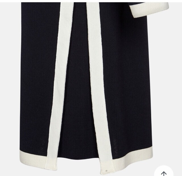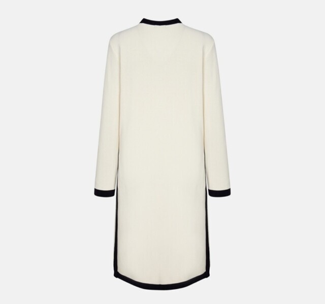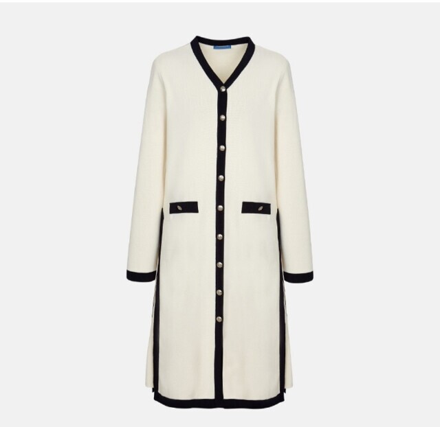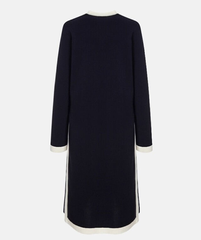 보색 트리밍이 화사하고 깔끔한 니트 원피스입니다.군더더기없는 깔끔한 라인으로 체형커버에도 좋아요