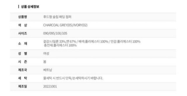 | 1. 제품 소재 (섬유의 조성 또는 혼용률을 백분율로 표시, 기능성인 경우 성적서 또는 허가서) | 상품상세참조 |
