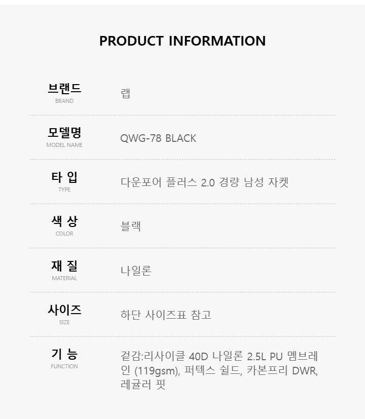 랩 QWG-78 BLACK 다운포어 플러스 2.0 경량 남성 자켓