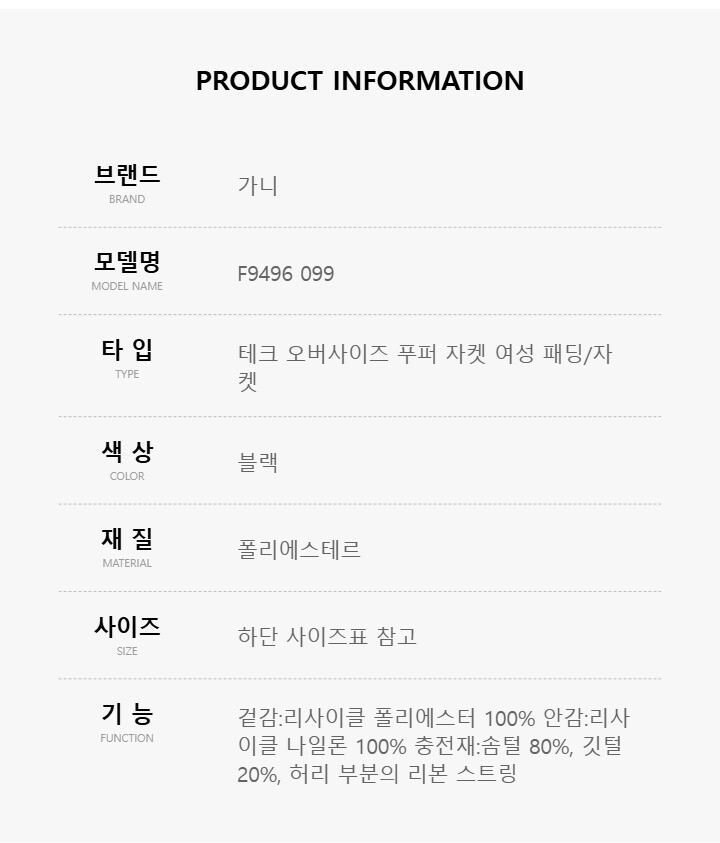 가니 F9496 099 테크 오버사이즈 푸퍼 여성 코트