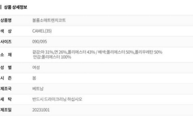 | 1. 제품 소재 (섬유의 조성 또는 혼용률을 백분율로 표시, 기능성인 경우 성적서 또는 허가서) | 상품상세참조 |