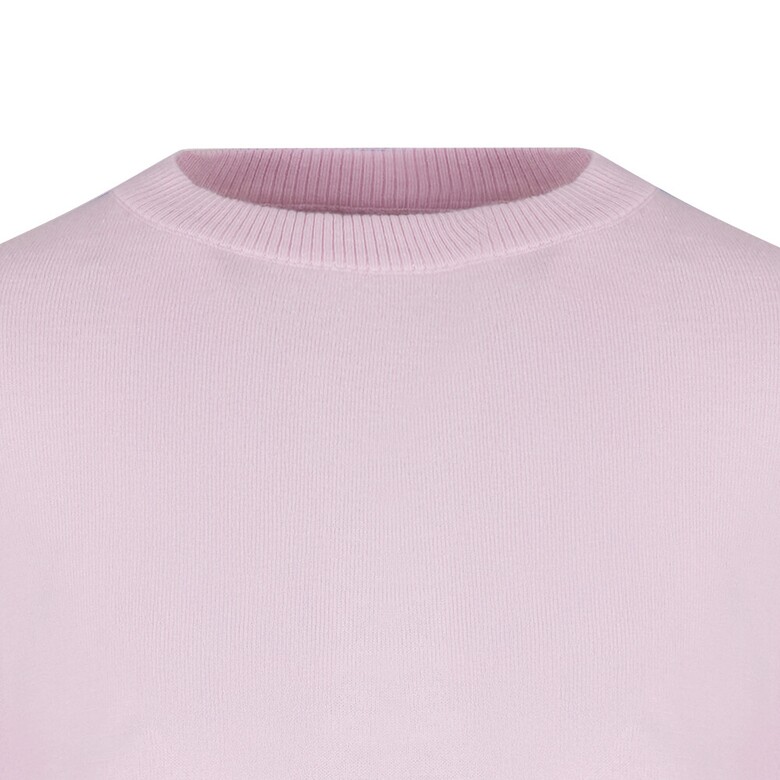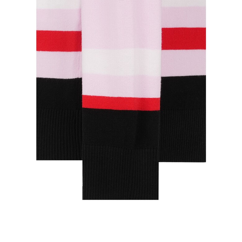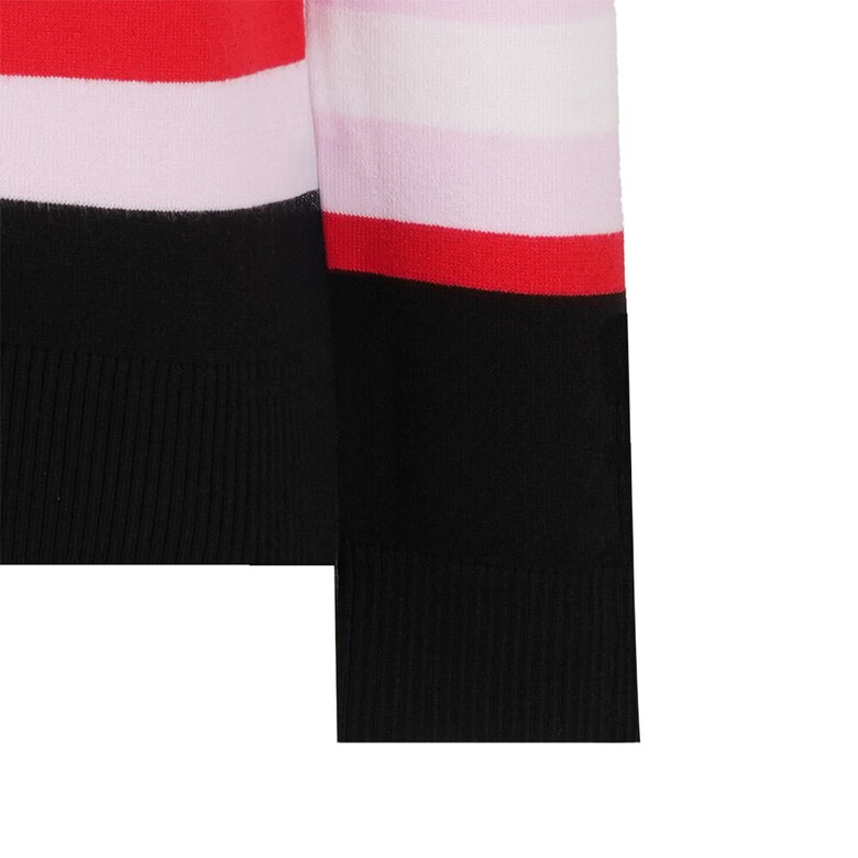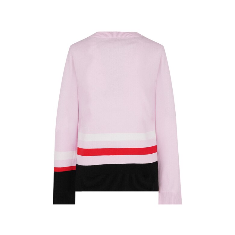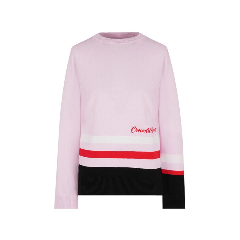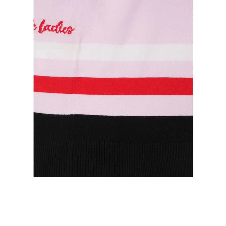 R/N/PBT원사를 사용하여 터치감이 부드러우며 밑단 부분 레터링JQD와 스트라이프가 포인트인 스포티하고 여성스러운 라운드 스웨터