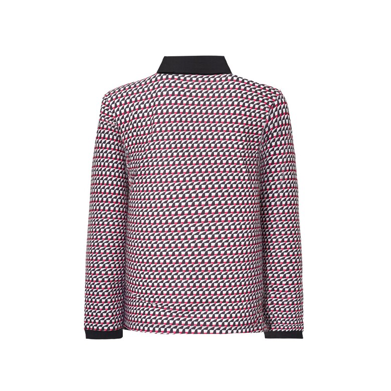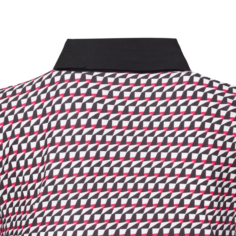 코트나 소재를 사용하여 터치감이 부드럽고 전판 기하학 프린트와 카라+소매단 솔리드 배색이 세련미를 더해주는 것이 포인트인 집업 카라 티셔츠