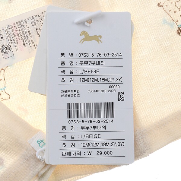 | 1. 제품 소재 (섬유의 조성 또는 혼용률을 백분율로 표시, 기능성인 경우 성적서 또는 허가서) | 무무7부내의 |