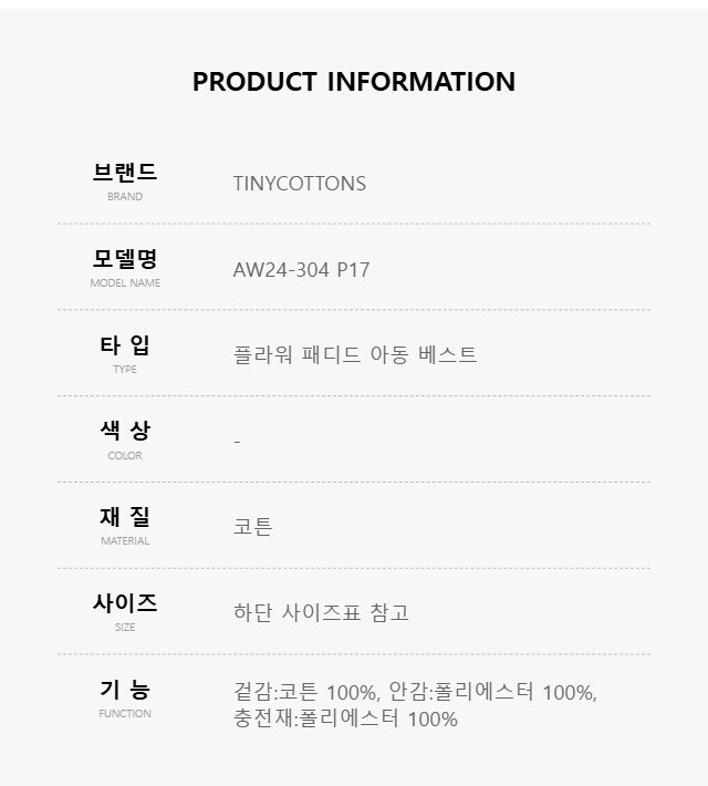 타이니코튼 AW24-304 P17 (Flowers padded vest) 플라워 패디드 아동 베스트