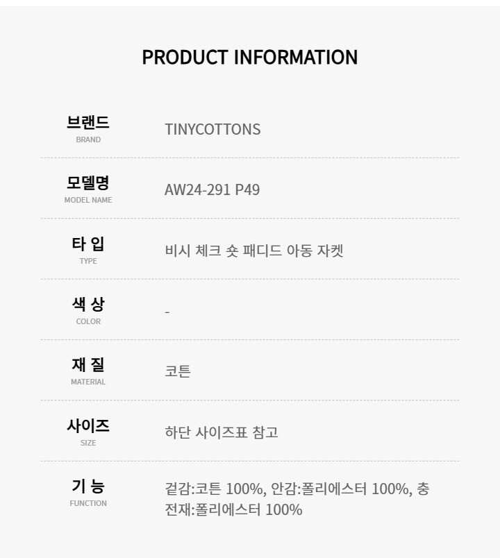 타이니코튼 AW24-291 P49 비시 체크 숏 패디드 주니어 자켓