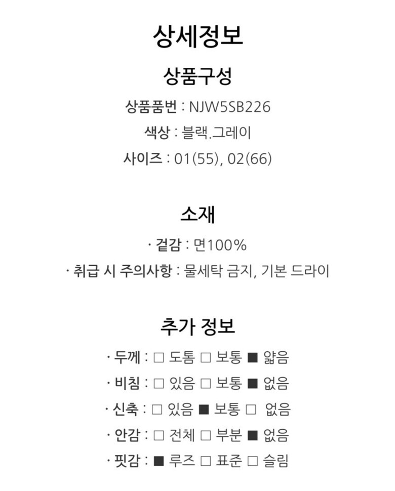 | 1. 제품 소재 (섬유의 조성 또는 혼용률을 백분율로 표시, 기능성인 경우 성적서 또는 허가서) | 상품상세참조 |