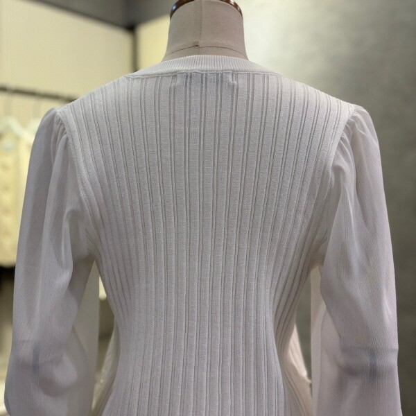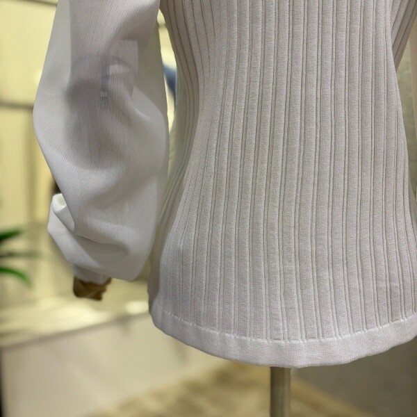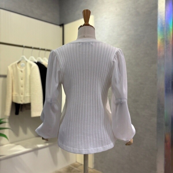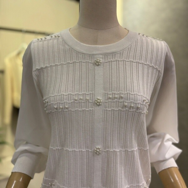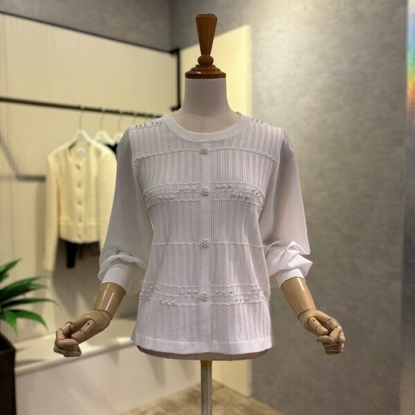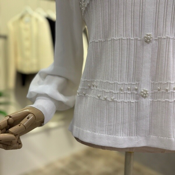 2025년 s/s 신상 시스루 소매 진주 장식 라운드 니트 입니다.
