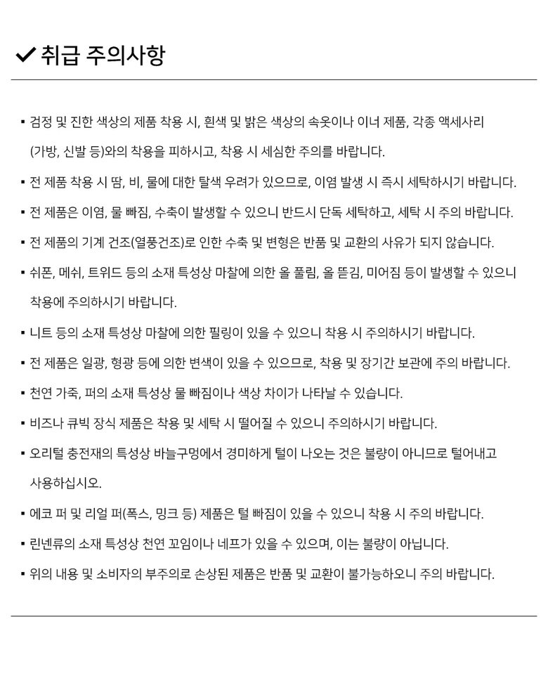 • 처음 배송된 상품상태와 다를 경우(세탁/착용 후 외출하신 경우) 반품이 불가합니다.