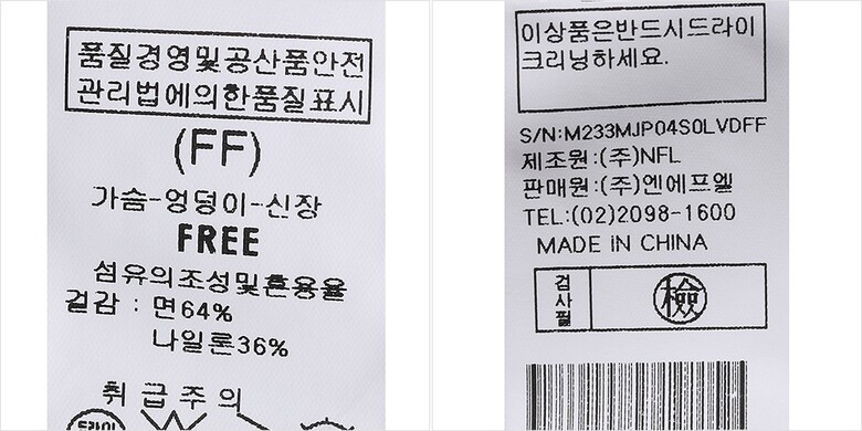 | 1. 제품 소재 (섬유의 조성 또는 혼용률을 백분율로 표시, 기능성인 경우 성적서 또는 허가서) | 겉감-면64% 나일론36% |