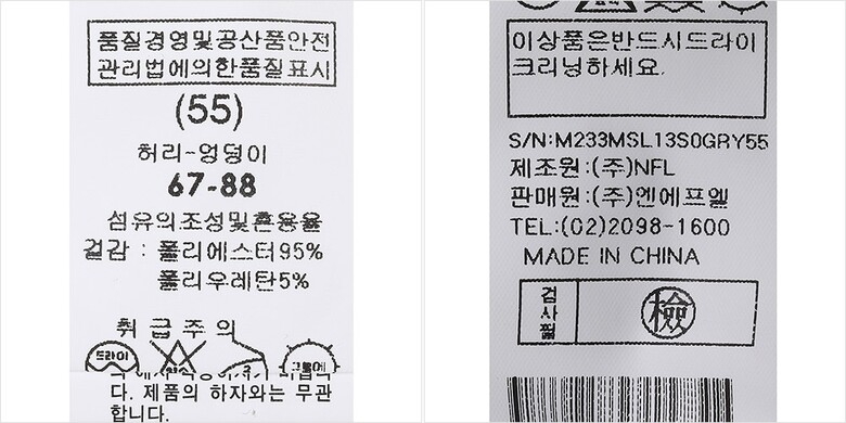 | 1. 제품 소재 (섬유의 조성 또는 혼용률을 백분율로 표시, 기능성인 경우 성적서 또는 허가서) | 겉감-폴리에스터95% 폴리우레탄5% |