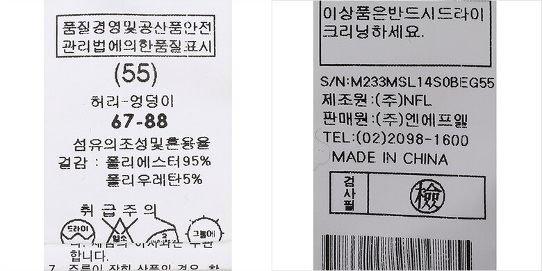 | 1. 제품 소재 (섬유의 조성 또는 혼용률을 백분율로 표시, 기능성인 경우 성적서 또는 허가서) | 겉감-폴리에스터95% 폴리우레탄5% |