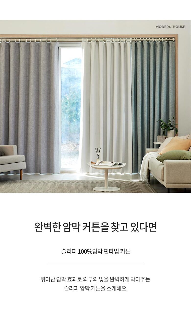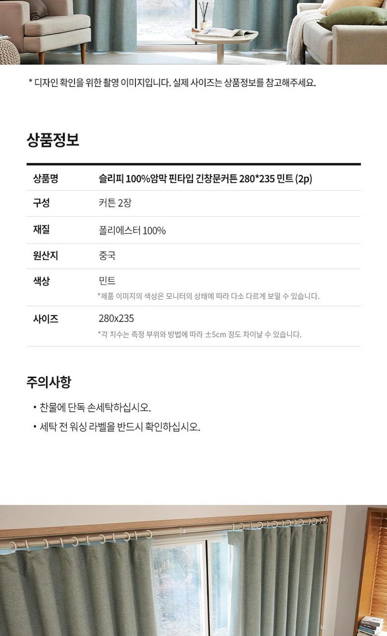 모던하우스 슬리피 100%암막 핀타입 긴창문커튼 280x235 민트 2p BL3625025