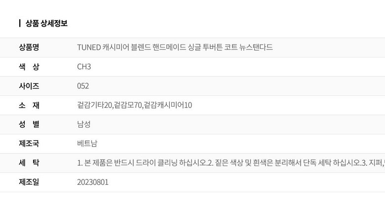 | 1. 제품 소재 (섬유의 조성 또는 혼용률을 백분율로 표시, 기능성인 경우 성적서 또는 허가서) | 겉감기타20,겉감모70,겉감캐시미어10 |