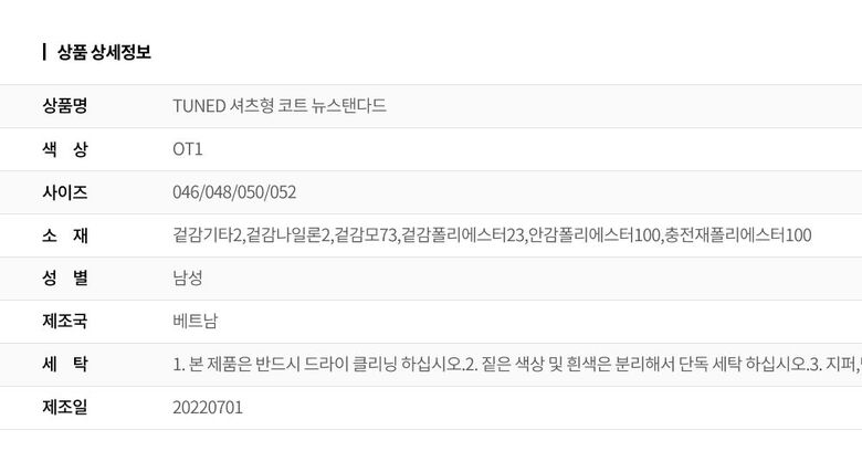 | 1. 제품 소재 (섬유의 조성 또는 혼용률을 백분율로 표시, 기능성인 경우 성적서 또는 허가서) | 겉감기타2,겉감나일론2,겉감모73,겉감폴리에스터23,안감폴리에스터100,충전재폴리에스터100 |