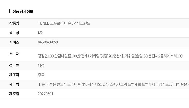 | 1. 제품 소재 (섬유의 조성 또는 혼용률을 백분율로 표시, 기능성인 경우 성적서 또는 허가서) | 겉감면100,안감나일론100,충전재1거위털(깃털)20,충전재1거위털(솜털)80,충전재2폴리에스터100 |