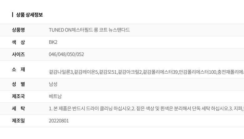 | 1. 제품 소재 (섬유의 조성 또는 혼용률을 백분율로 표시, 기능성인 경우 성적서 또는 허가서) | 겉감나일론3,겉감레이온5,겉감모51,겉감아크릴2,겉감폴리에스터39,안감폴리에스터100,충전재폴리에스터100 |