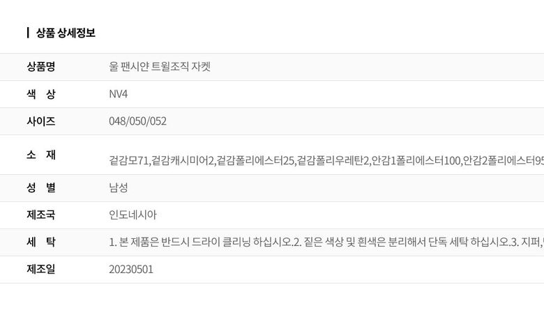 | 1. 제품 소재 (섬유의 조성 또는 혼용률을 백분율로 표시, 기능성인 경우 성적서 또는 허가서) | 겉감모71,겉감캐시미어2,겉감폴리에스터25,겉감폴리우레탄2,안감1폴리에스터100,안감2폴리에스터95,안감2폴리우레탄5 |