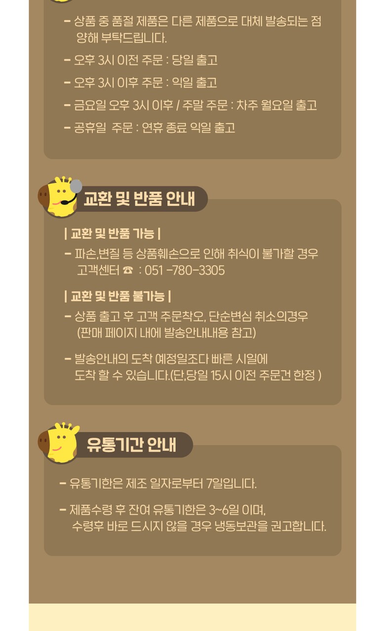 4. 생산일자,유통기한 | 1.냉장:상시제조/소비기한은 제조 일자로부터 7일 입니다.2.실온/냉동 제조연월일 :상시 제조 상품으로 잔여 소비기한이 3분의 1이상인 제품으로 출고되고 있으며, 소비 기한이 비교적 짧은 제품은 최소 13달이상 남은 제품으로 출고됩니다. |