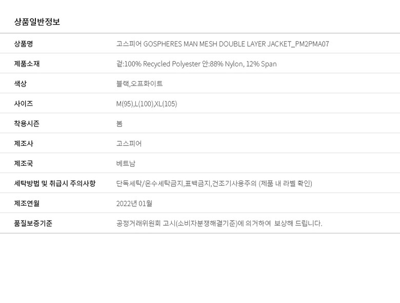 고스피어 GOSPHERES MAN MESH DOUBLE LAYER JACKET_PM2PMA07