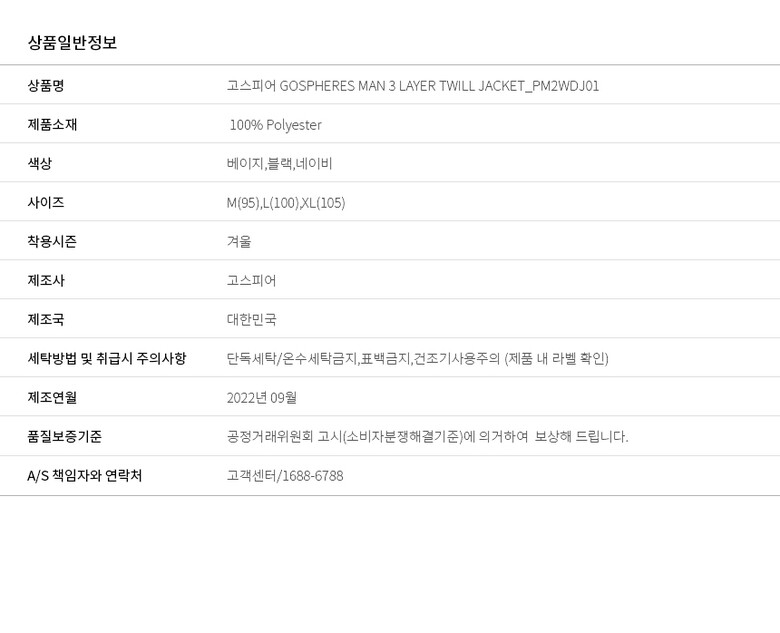 | 6. 세탁방법 및 취급시 주의사항 | 단독세탁/온수세탁금지,표백금지,건조기사용주의 (제품 내 라벨 확인) |