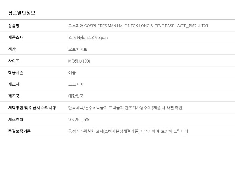 | 6. 세탁방법 및 취급시 주의사항 | 단독세탁/온수세탁금지,표백금지,건조기사용주의 (제품 내 라벨 확인) |