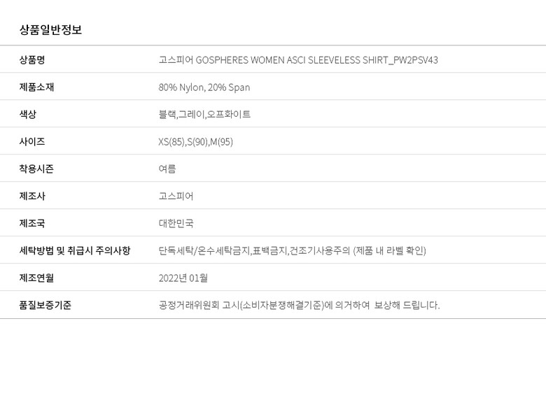 | 6. 세탁방법 및 취급시 주의사항 | 단독세탁/온수세탁금지,표백금지,건조기사용주의 (제품 내 라벨 확인) |