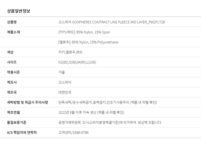 1. 제품 소재 (섬유의 조성 또는 혼용률을 백분율로 표시, 기능성인 경우 성적서 또는 허가서) | [카키/레드]: 85% Nylon, 15% Span / [옐로우]: 85% Nylon, 15% Polyurethane |