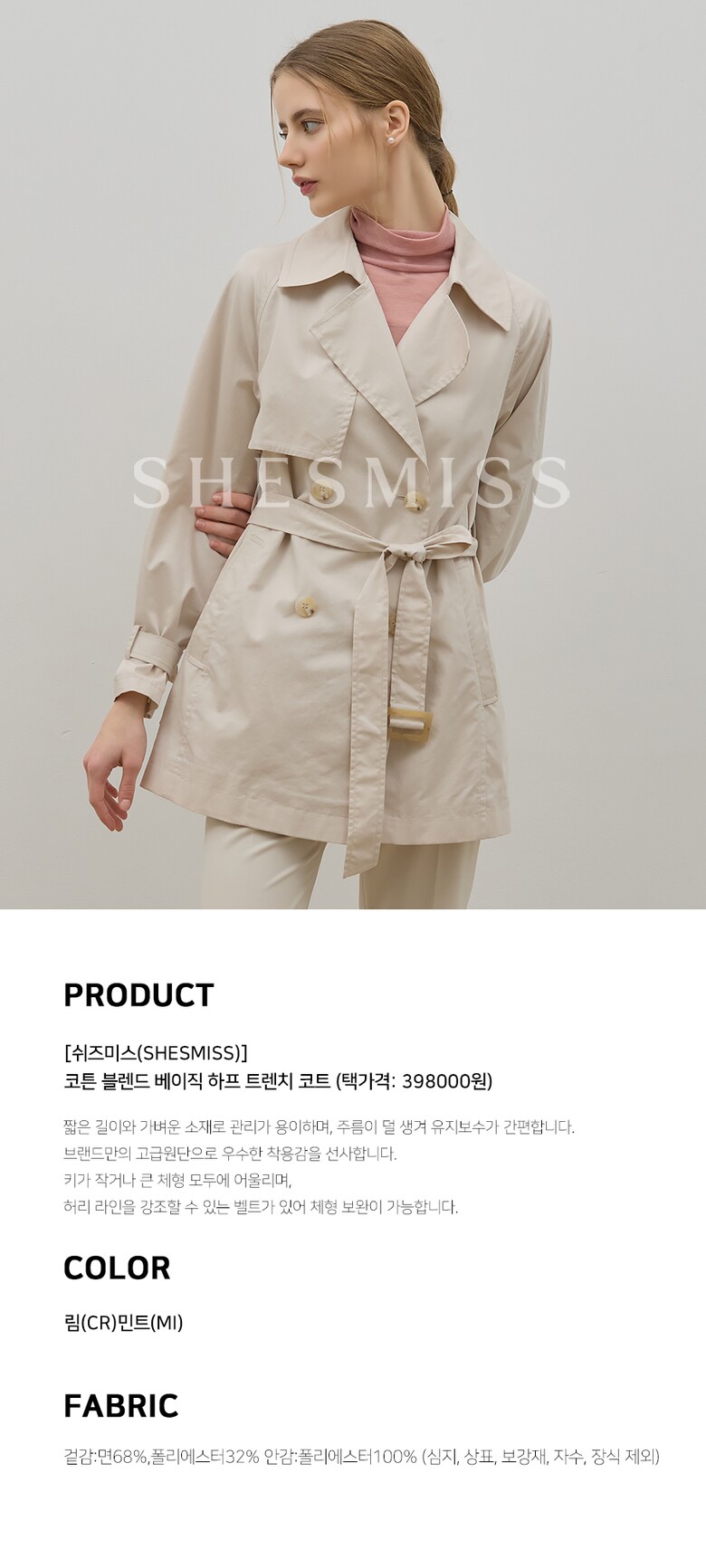 [쉬즈미스(SHESMISS)] 코튼 블렌드 베이직 하프 트렌치 코트 (택가격: 398000원)