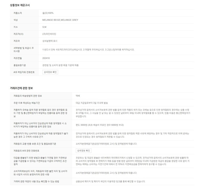 | 6. 세탁방법 및 취급시 주의사항 | 상품상세참조 |