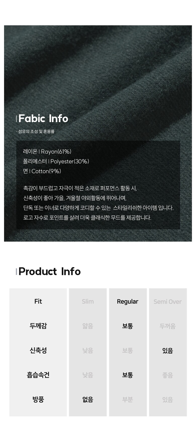 | 1. 제품 소재 (섬유의 조성 또는 혼용률을 백분율로 표시, 기능성인 경우 성적서 또는 허가서) | 레이온(61%),폴리에스터(30%),면(9%) |
