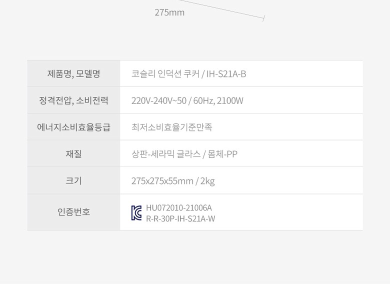 1. 모델명(품번) | 코슬리 인덕션 위드 / IH-S21A-B |