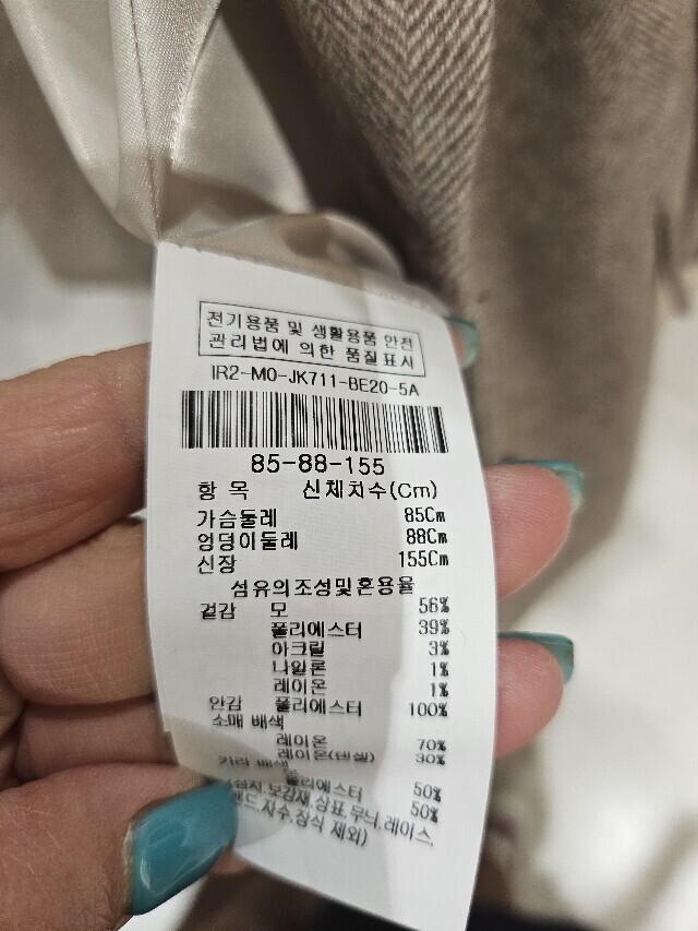 1. 제품 소재 (섬유의 조성 또는 혼용률을 백분율로 표시, 기능성인 경우 성적서 또는 허가서) | 모40%,폴리에스터 40%,아크릴6%,레이온2%나일론2%,면1% |