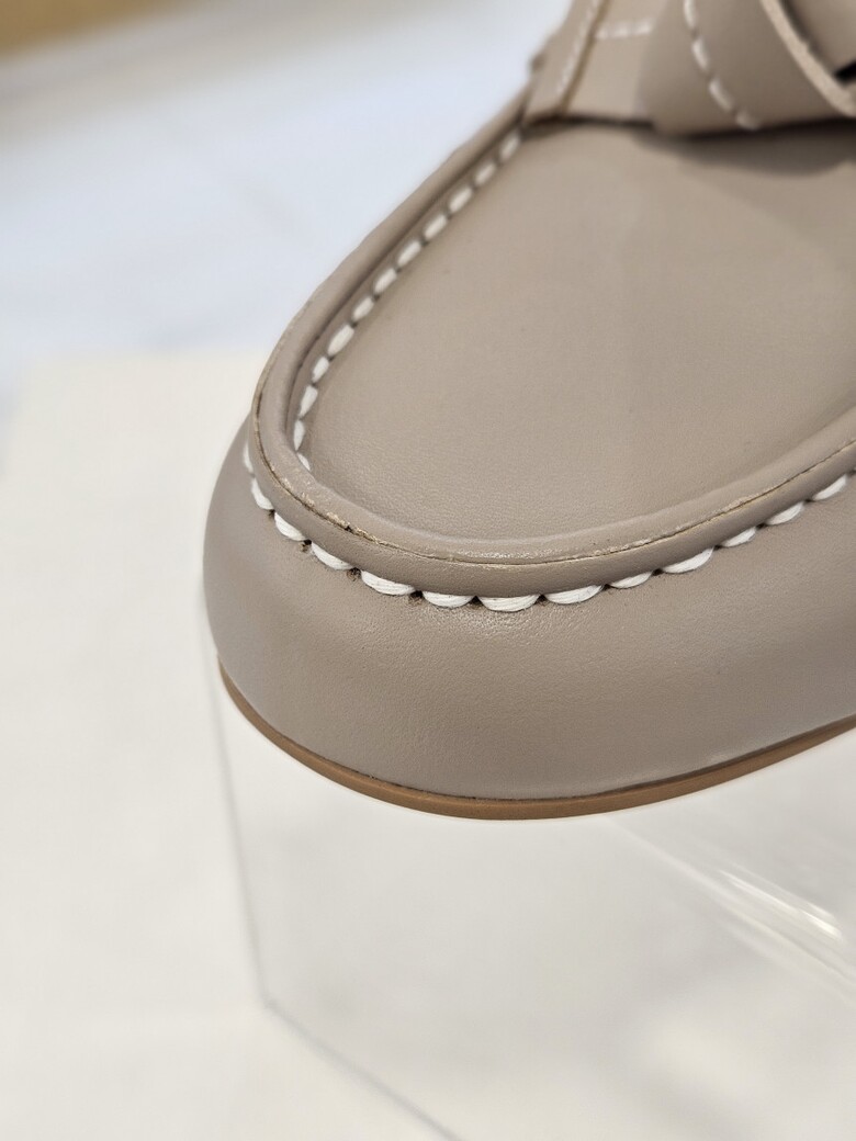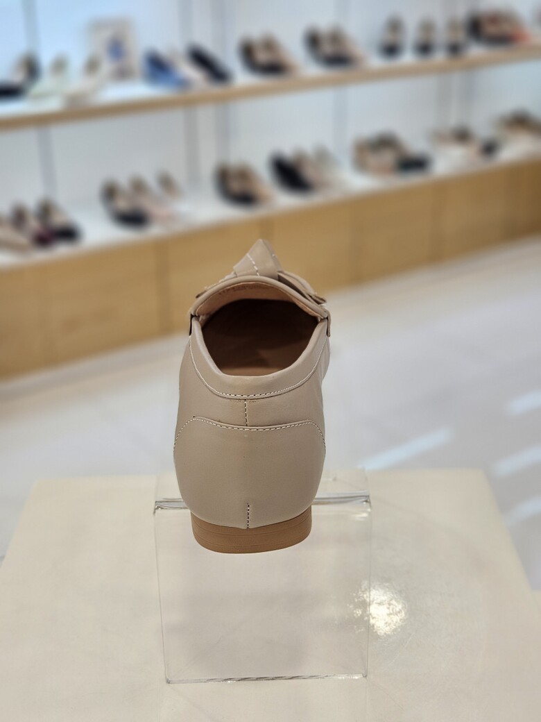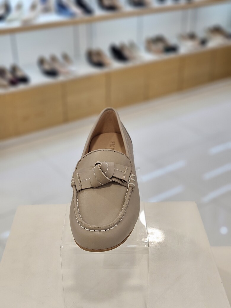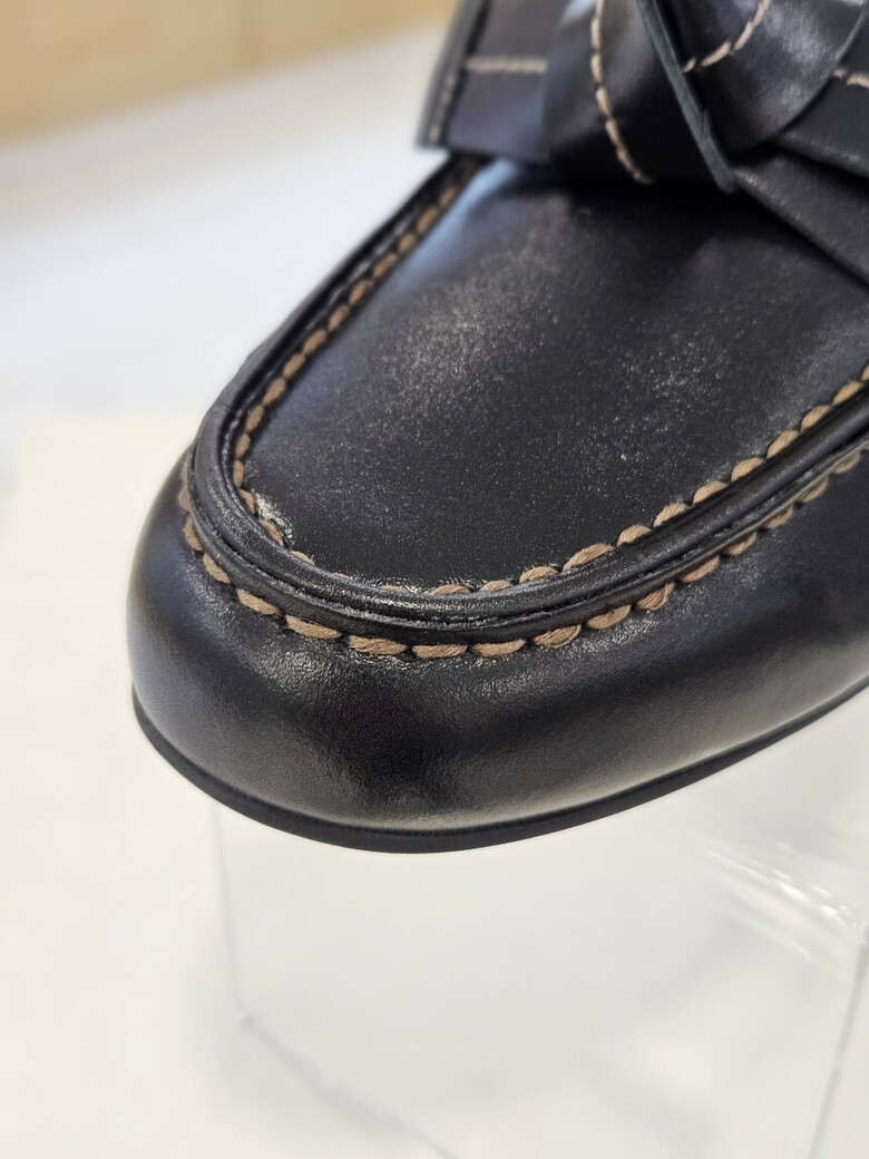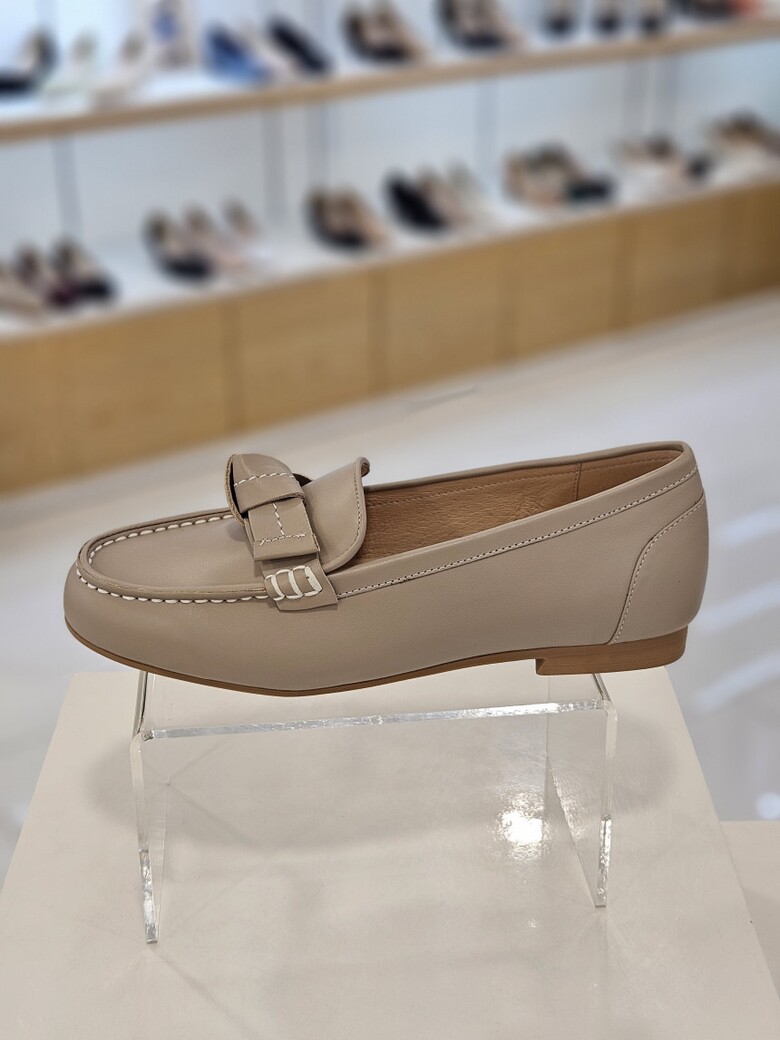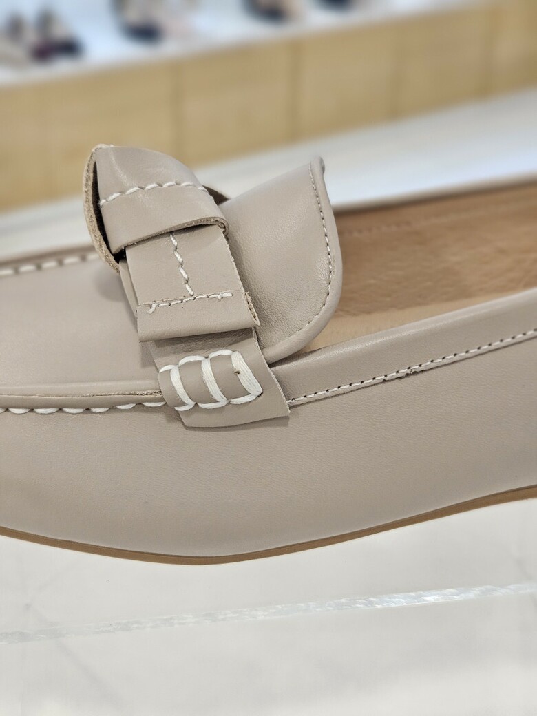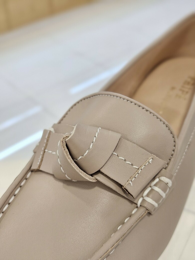 매듭 스타일의 장식과 베이직한 컬러감으로 제작된 여성 가죽장식 로퍼