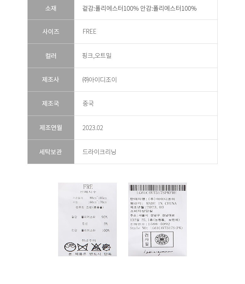 | 1. 제품 소재 (섬유의 조성 또는 혼용률을 백분율로 표시, 기능성인 경우 성적서 또는 허가서) | 상세페이지 참조 |