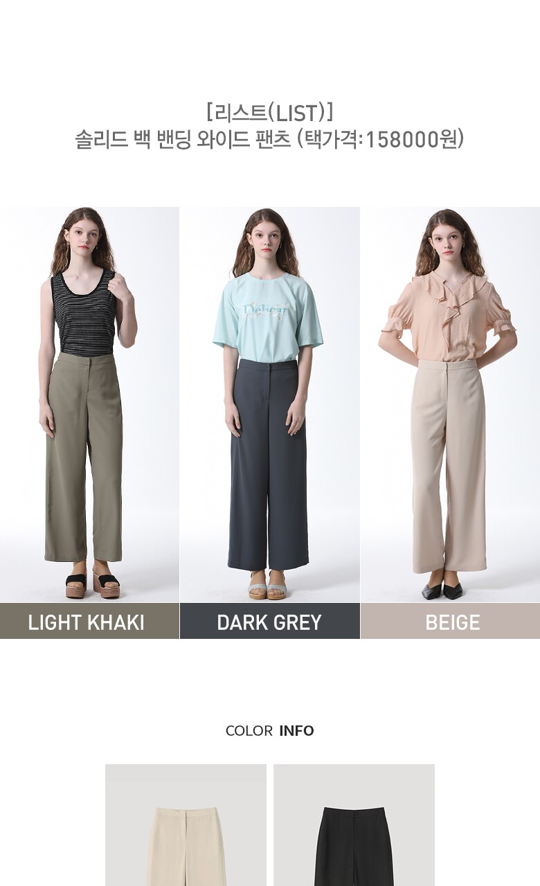 ▶ ITEM : 솔리드 백 밴딩 와이드 팬츠 ▶ NUMBER :TWWSLM62060 ▶ FABRIC : [겉감] 폴리에스터 100% ▶ WASHING : 단독드라이(고온불가.미어짐.필링.이염) ▶ 원 산 지 : 베트남 ▶ 색 상 : 라이트카키(LK),다크그레이(DG),베이지(BE)