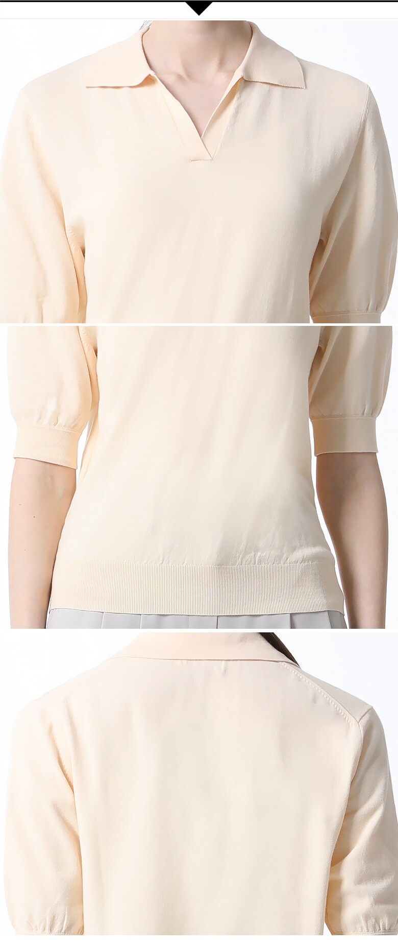 이너로 입기 좋은 오픈 칼라 디자인의 반팔 니트 풀오버입니다.